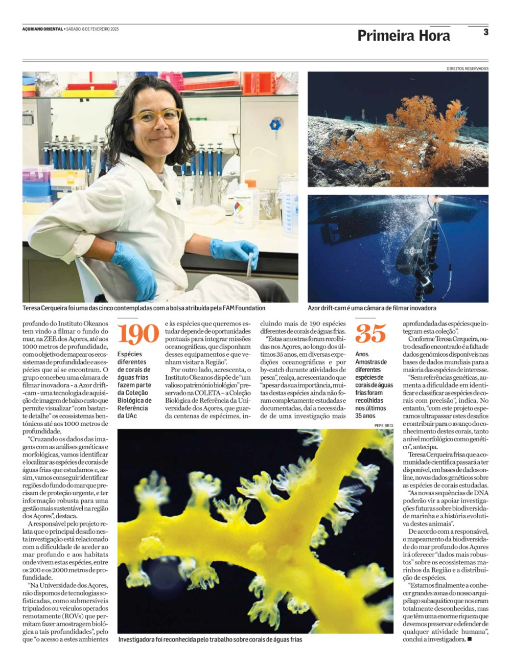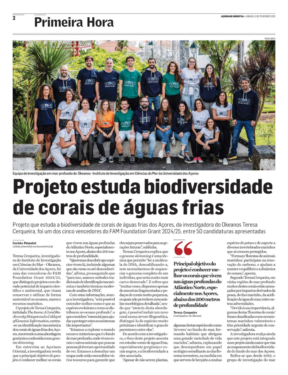 The Azores host a remarkable diversity of benthic communities, in which cold-water corals act as key ecosystem engineers. These corals play a critical role in enhancing local biodiversity by providing refuge, feeding, and breeding grounds for numerous marine species. Their loss can have lasting impacts on marine biodiversity and the ecosystem services they support, making their conservation an urgent priority. This FAM project aims to advance our understanding of cold-water coral biodiversity in the Azores which are commonly regarded as biodiversity hotspots. The work will be conducted in collaboration with the Smithsonian’s National Museum of Natural History (Washington, DC) through an integrative approach that combines traditional morphological analyses with the molecular technique of genome skimming. This will enable, for the first time, a comprehensive exploration of coral genomes from this region.